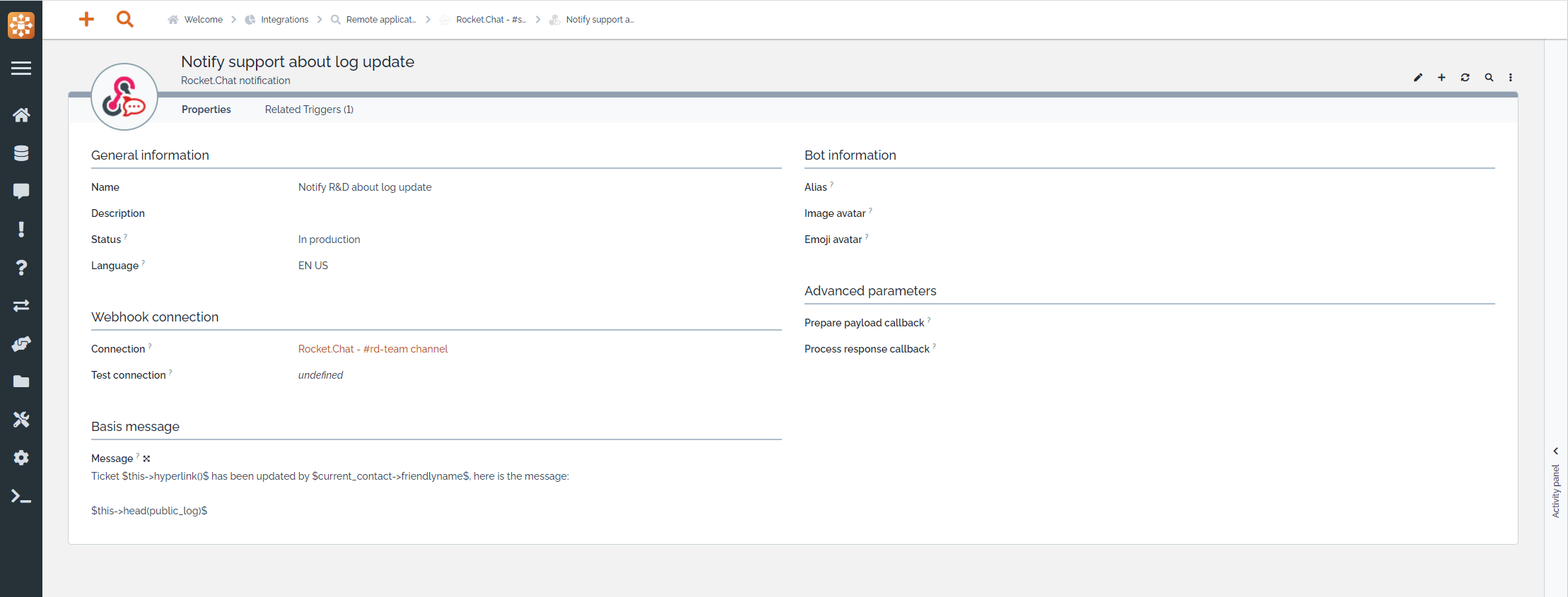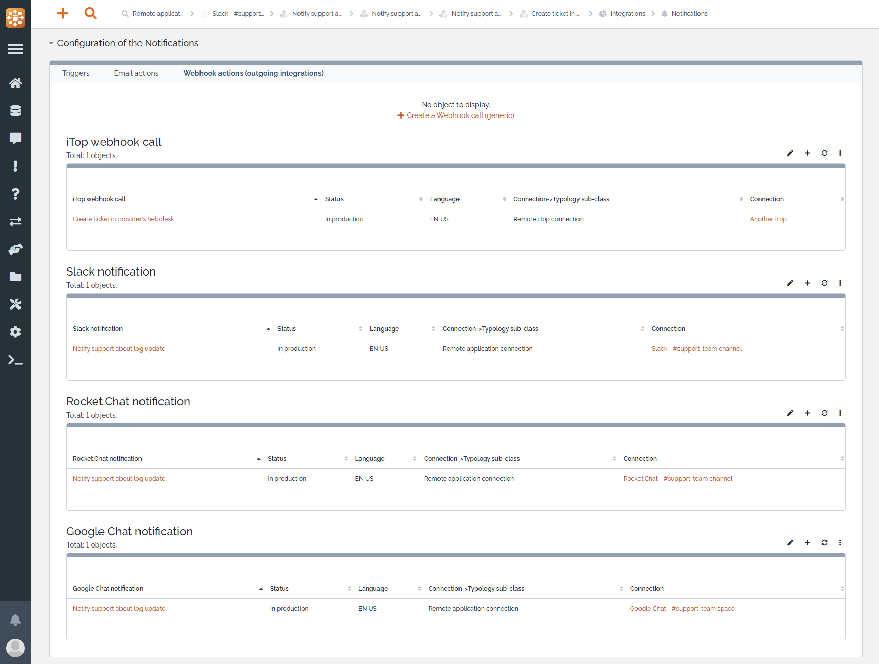 | 2024-08-06 | 1.4.0 | * N°2039 - Increase iTop min. version to 3.2.0 * N°2039 - Add complementary name on child classes to avoid empty summary cards in iTop 3.1+ * N°7044 - Move âlanguageâ attribute from ActionWebhook to ActionNotification * N°5194 - Enable webhook actions to be asynchronous in order to save response callback value * N°7170 - Support of PHP 8.3: Fix usages of get_class() without argument * N°7499 - Rework actions / events class labels * N°7589 - Move menu under Integrations * N°7691 - Update german translations thanks to @Attila0428 |
