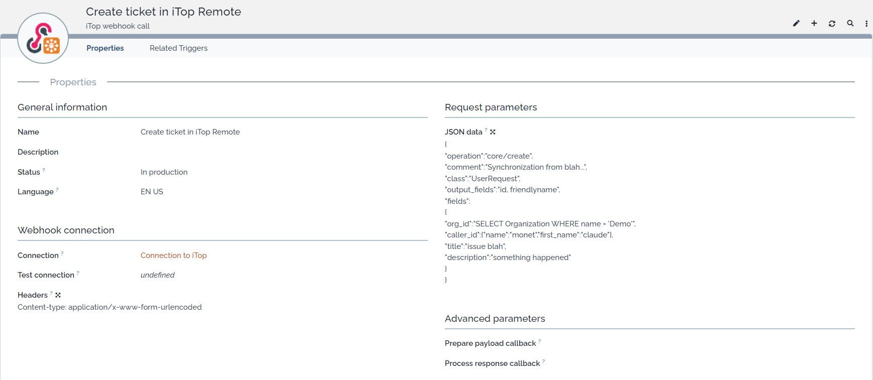 See Transfer Ticket to another iTop for a complete tutorial on how to synchronise two iTop with iTop Webhook