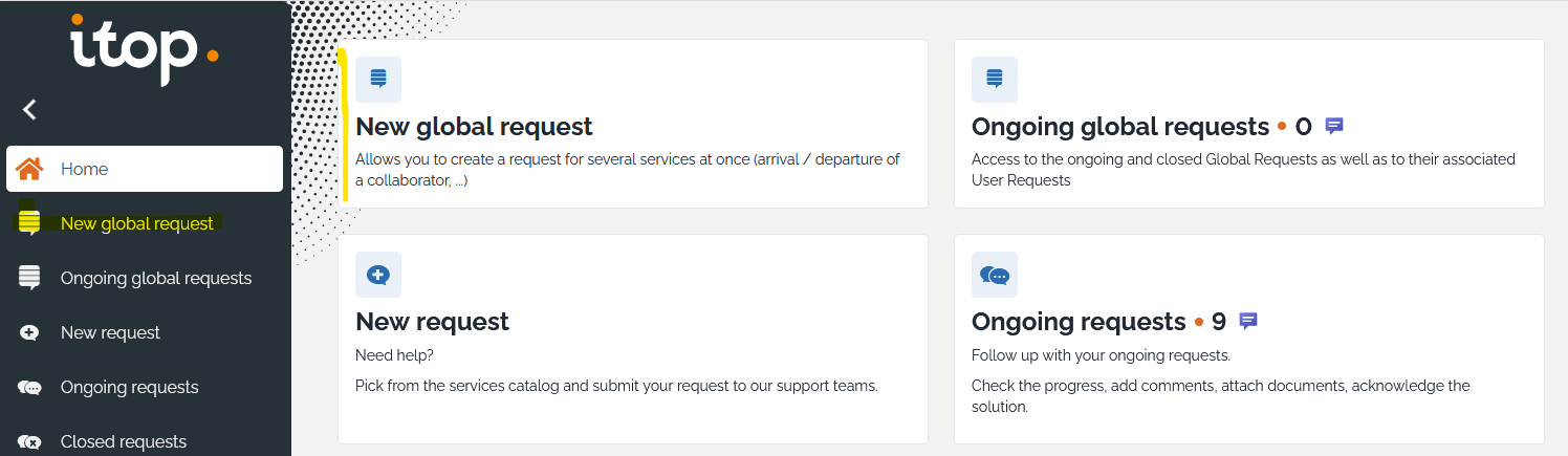 | 2020-03-11 | 1.1.0 | * Add compatibility with iTop 2.7.0 * Add tab counter on global requests Manage brick * Enable navigation rules for global request forms (iTop 2.7+ only) |