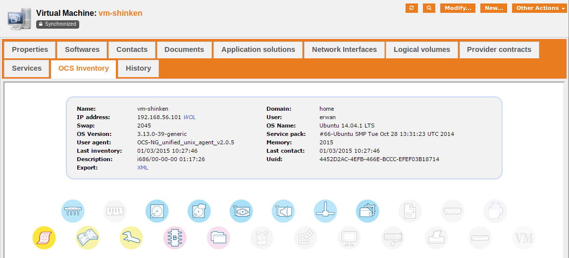 An optional small extension is available to display an extra tab “OCS Inventory” on synchronized PCs, Servers and VirtualMachines. This tab displays the OCS page for the device (using an IFRAME).