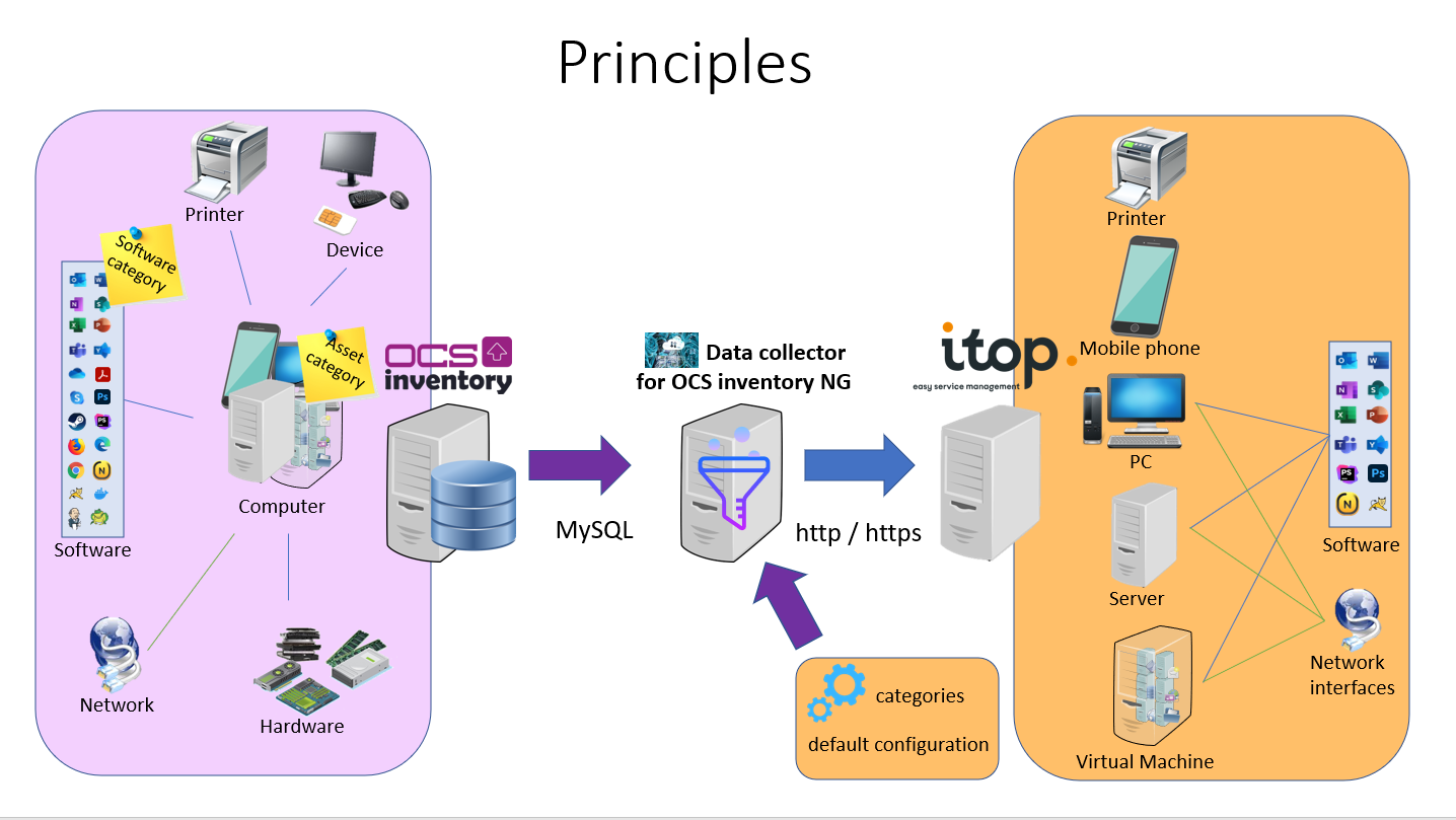 This stand-alone application collects information from a single OCS Inventory NG server in order to populate the iTop CMDB with the collected Servers, PCs and Virtual machines. The collector uses the iTop data synchronization engine to synchronize the information between OCS Inventory and iTop.