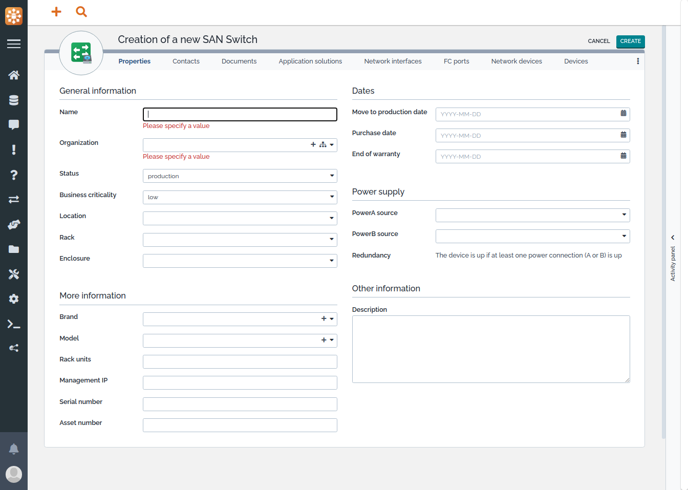• Impacts: a SAN Switch impacts the devices connected to it (Network Devices, other SAN Switches, Servers, Tape Libraries, NAS, etc.) the Application Solutions that this SAN Switch is part of and all the contacts (Persons, Teams) directly linked to the SAN Switch.